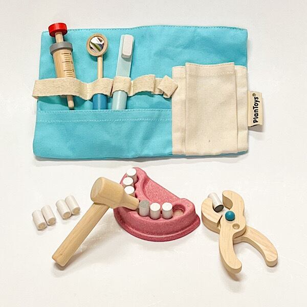歯医者さんごっこは、ごっこ遊びの中で歯の大切さを学ぶことのできる楽しいアイテムです。4種類の基本的な治療器具、歯ブラシや歯の模型などこどもたちにとっては興味津々のアイテム揃い。手指を器用に使いながら、いろいろな場面を想像しながら、歯の大切さを学んでいきます。全て木製の可愛いパーツは、子どもたちの恐怖心をなくし、木のぬくもりや木目の美しさを身近に感じることができます。