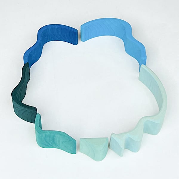 セイヨウナシノキを丁寧にくりぬいたはめこ式の木の積み木です。エレメントウォーター小の縮小版、6つのパーツを並べたり、スライドさせてトンネルにしたり、おままごと遊びや積み木あそびに参加させたり、、遊びが広がってきます。グリムス社の商品はこどもが創造的に遊べることを考えてデザインされています。そのデザインの美しさは世代を超えてお使いいただけます。素敵なインテリアにも。