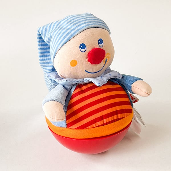 座らせて、そっと押してみましょう。倒れそうになったキャスパー君は、鈴の音を鳴らしながら起き上がってきます。可愛い動作と鈴の音は赤ちゃんを夢中にします。おすわりができた赤ちゃんから遊べます。