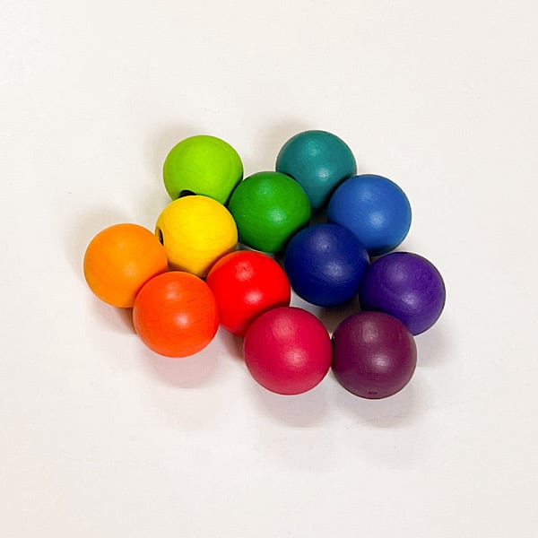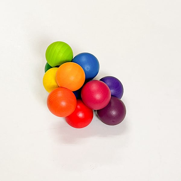 直径2.5cmの12個の球が丈夫なゴムでつながっています。赤ちゃんの手に持ちやすいおしゃれなガラガラです。手を動かす事に夢中な赤ちゃんにぴったりのおもちゃです。形を変えて素敵なインテリアにもなりますよ。