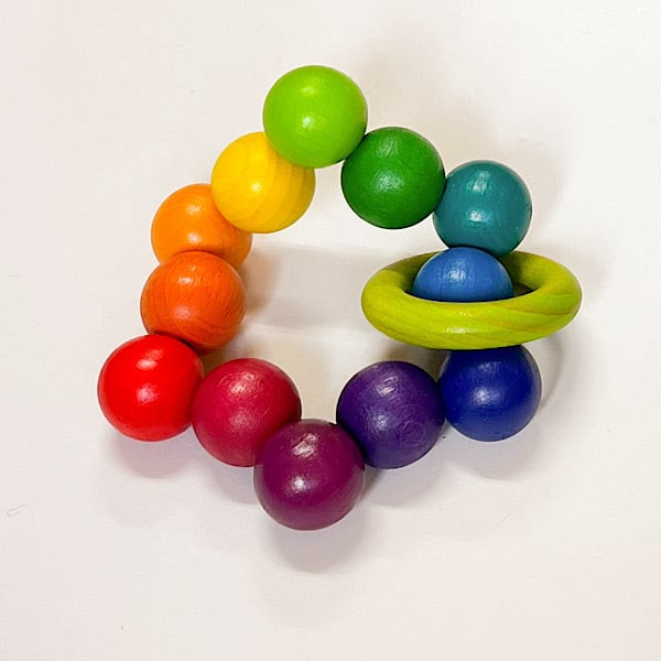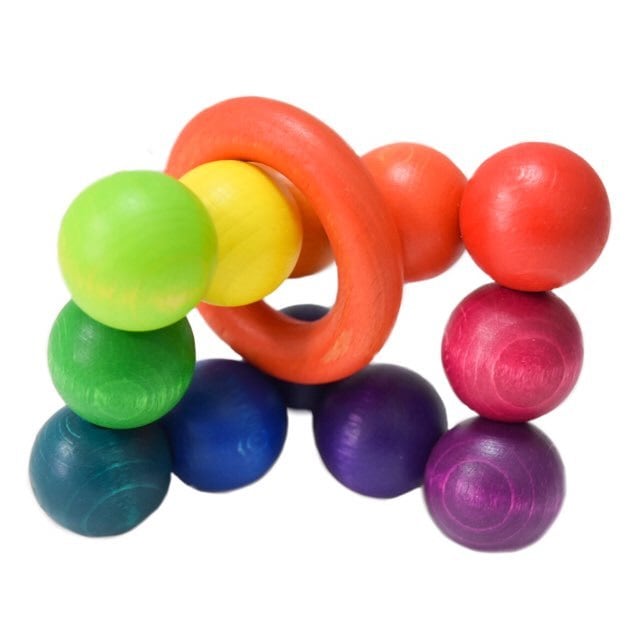 12個の球と1つのリングが丈夫なゴムでつながっています。自分の手を動かす事に夢中の赤ちゃんにぴったりのおもちゃです。自由に形を変えることができるので、素敵なインテリアにも。なお中に入っている1つのリングの色は赤・紫・えんじ・緑・黄がありますが、色はお選びいただけません。