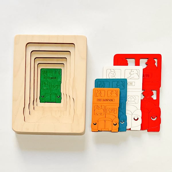 このパズルは、伝統的なロンドンの2階建てバスが5層になった5重パズルです。大きい赤いバスの下には白いバスが,その下には青、黄色、緑のバスが隠れています。子どもははめ込むことが大好き。最初は大人がいっしょに遊んであげましょう。