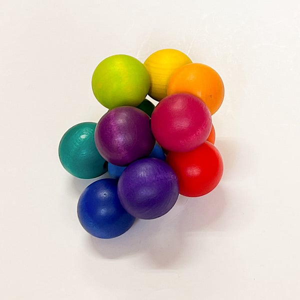 直径2.8cmの12個の球が丈夫なゴムでつながっています。クーゲルンより木玉がひと回り大きいサイズです。赤ちゃんの手に持ちやすいおしゃれなガラガラは手を動かす事に夢中な赤ちゃんにぴったりのおもちゃです。形を変えて素敵なインテリアにもなりますよ。