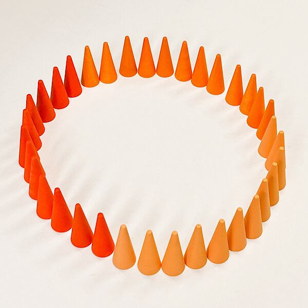 まんだらシリーズはいろいろな遊びの材料として活躍します。例えばオレンジコーンはコーンのようなパーツがいっぱい。お菓子になったり、帽子になったり、きのこになったり、床に並べてみると素敵なアートに、、楽しい楽しいおもちゃです。