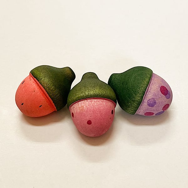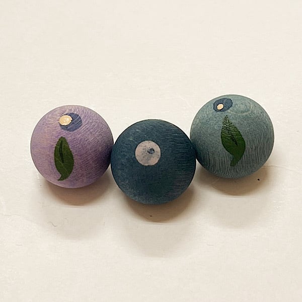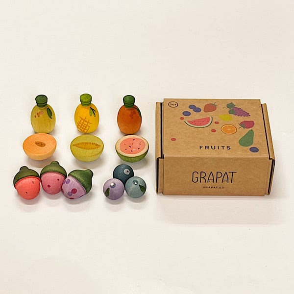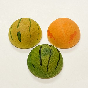 ミニフルーツはパインアップルやイチゴのようなものやスイカやメロンのようなものなど12ピース。子どもたちは色々なフルーツを想像しながら遊びの世界へ。床に並べてみると素敵なアートに、、楽しい楽しいおもちゃです。