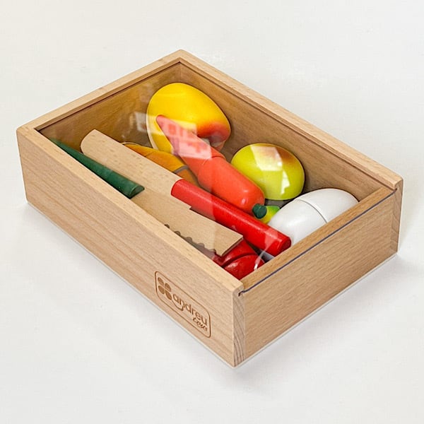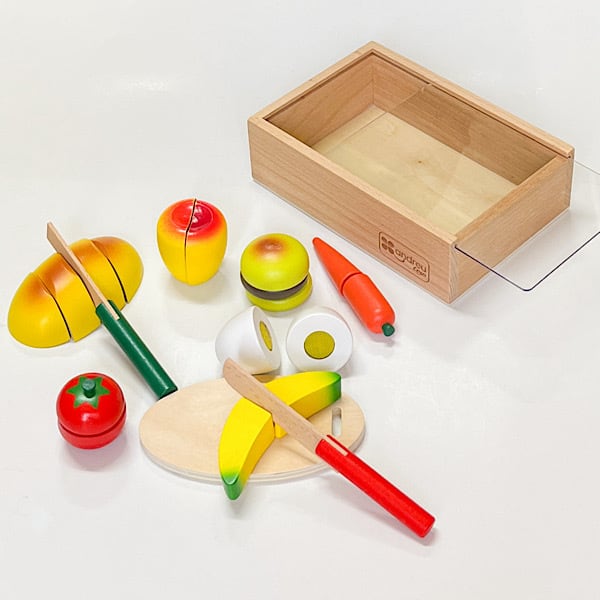 カッティングブレッドは、小さな手にも持ちやすい大きさ、マジックテープでついているのでナイフで切るとザクッと音がします。木箱に入っているので、お片付けも簡単、ままごと遊びが実体験へとつながっていきます。ナイフは普通のナイフとパン切り用のナイフがあります。