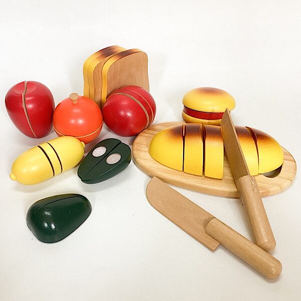 カッティングブレッドは、一つ一つの食材が本物に近い大きさで、小さな手にも持ちやすくなっています。マジックテープでついているのでナイフで切るとザクッと音がします。ままごと遊びが実体験とつながります。