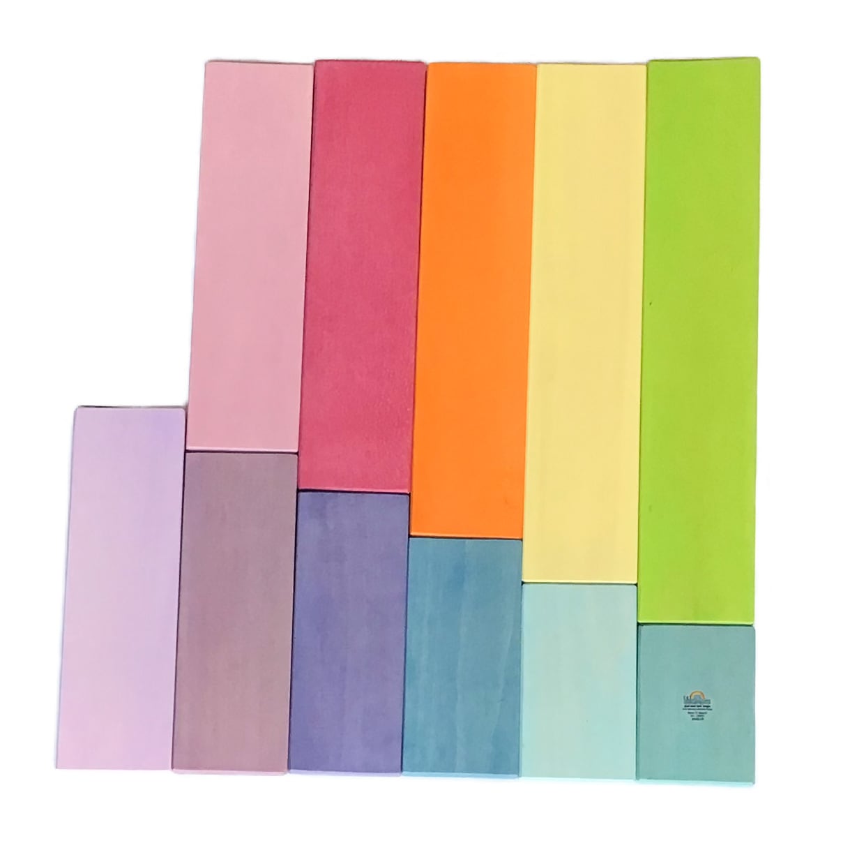 虹の色からうまれたグリムス社の個性的なつみきです。アーチレインボー(虹色トンネル)や積み木と組み合わせることで。立体や空間への遊びが広がってきます。