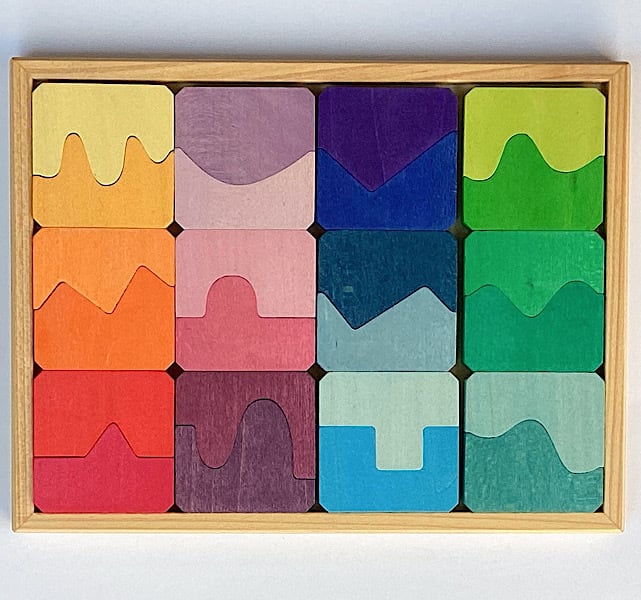 凹凸にかみ合った正方形パズルが12枚。色や形の組み合わせがそれぞれ違います。まず形あわせから始めてみましょう。木箱をキャンパスにして色々な形や絵を描いてみたり、、積み重ねて色々な形を作ってみたり、、美しいグラデーションは遊びの世界が広がります。