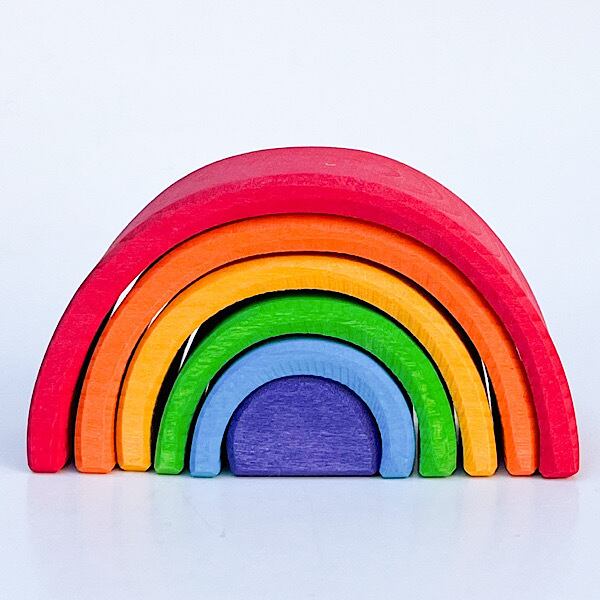 1本の木をくりぬいて作ってあります。重ねたり、ずらしてみたり、反対向けに重ねればシーソーのように・・子どもは遊びの世界に夢中になります。レインボーカラーは素敵なインテリアにもなります。
