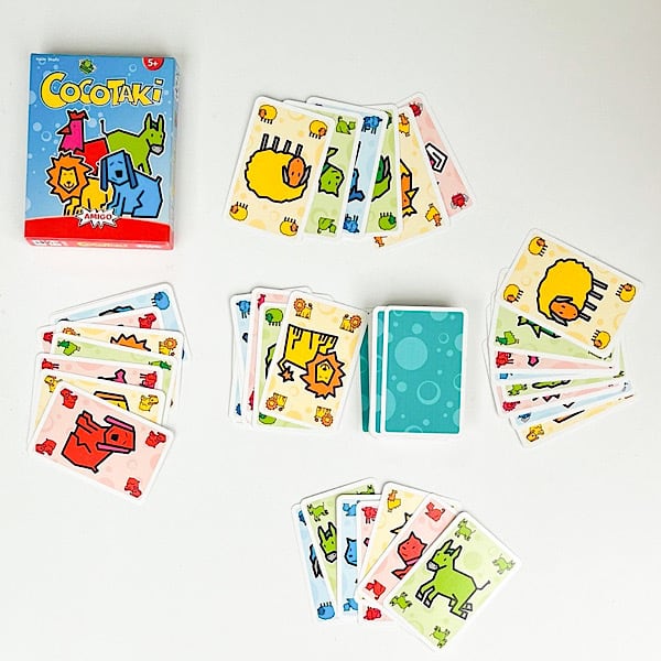 カードを各自8枚ずつ配り、残りは山札にして中央へ、一番上のカードはめくって、山札の横に置きます。各自、自分の番になったら、場札と同じ動物か同じ色のカードを捨てることが出来ます。