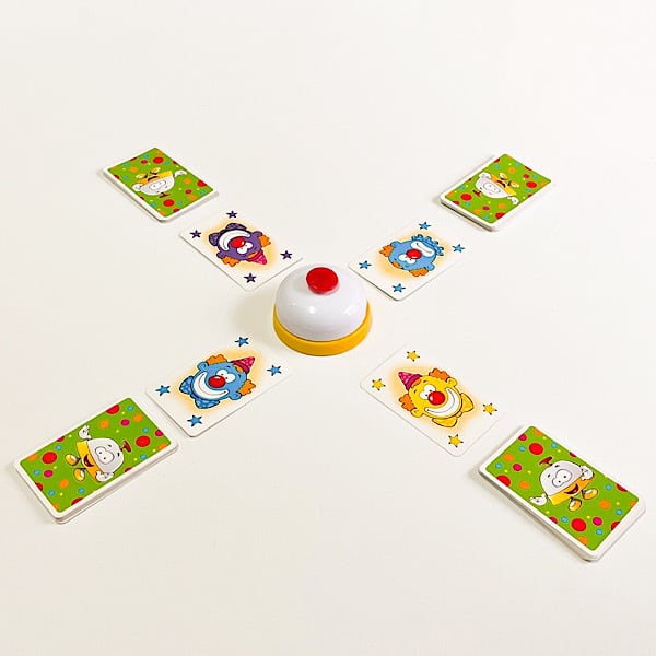 どんどんピエロが変わっていくので、大変です。同じ色で笑っているピエロが2枚そろったら、素早く(チン!)とベルを鳴らしましょう。鳴らした人は、場にあるカードを全部もらって自分の山札の下に重ねることが出来ます。鳴らしたけど、間違っていたらペナルティとして自分のカードを一枚ずつプレイヤーに配らなければなりません。手札がなくなったプレイヤーから脱落、最後に残った人の勝ちになります。ルールを色々変えて遊んでみましょう。