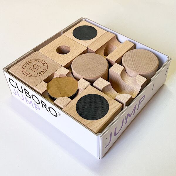 キュボロジャンプはキュボロ補充セットの1つです。黒い部分はゴムでできているので、そこに勢いよくぶつかると玉が跳ね上がります。目の前に小さな障害物を作って飛び越えさせてみましょう。キュボロスタンダードやキュボロジュニアとセットにするとより長い道を楽しむことが出来ます。